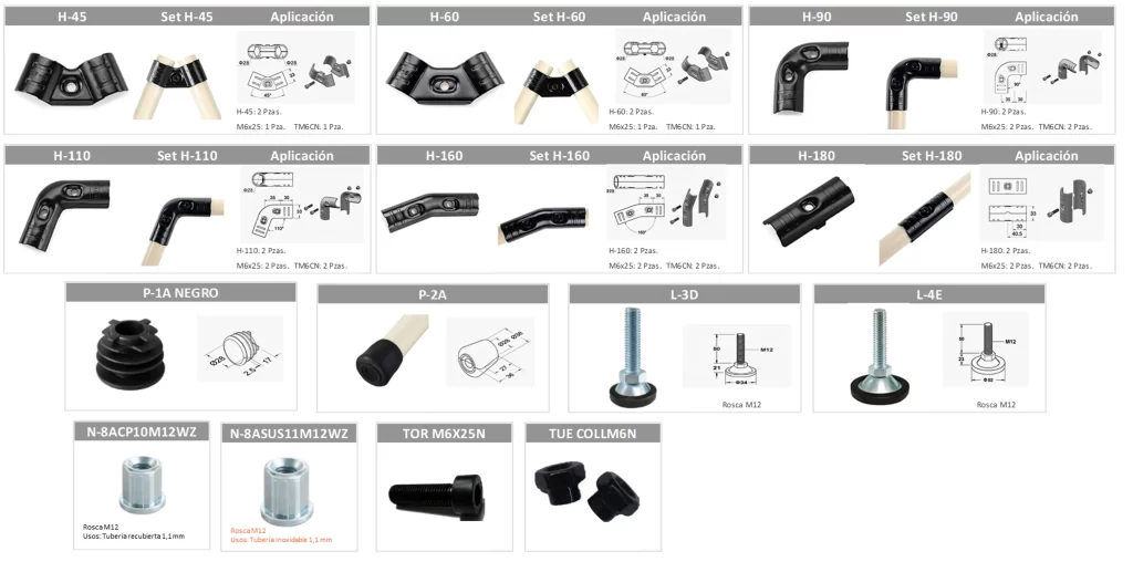 Pies niveladores, tapones, porta-ruedas y accesorios de anclaje. Complementan cualquier configuración estructural.